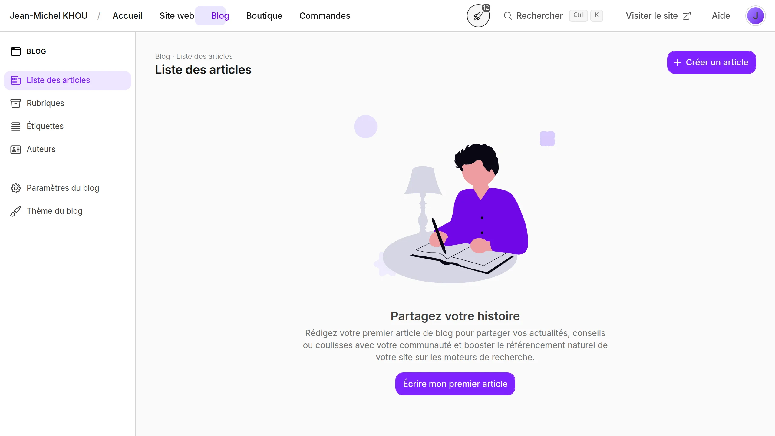 Cette section liste tous vos articles avec leur titre, leurs rubriques, leurs étiquettes, leurs auteurs et leur état (visible ou non sur le site). Cliquez sur une ligne pour ouvrir un article, ou sur Créer un article pour en rédiger un nouveau.