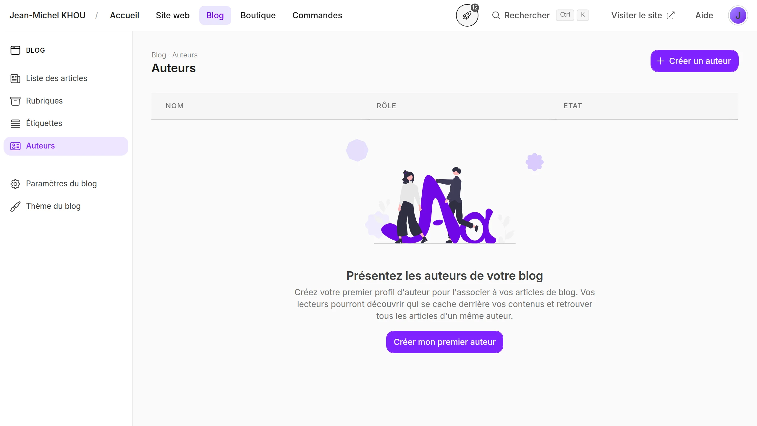 Cette section liste tous vos auteurs avec leur nom, leur rôle et leur état. Chaque auteur peut être associé à plusieurs articles.