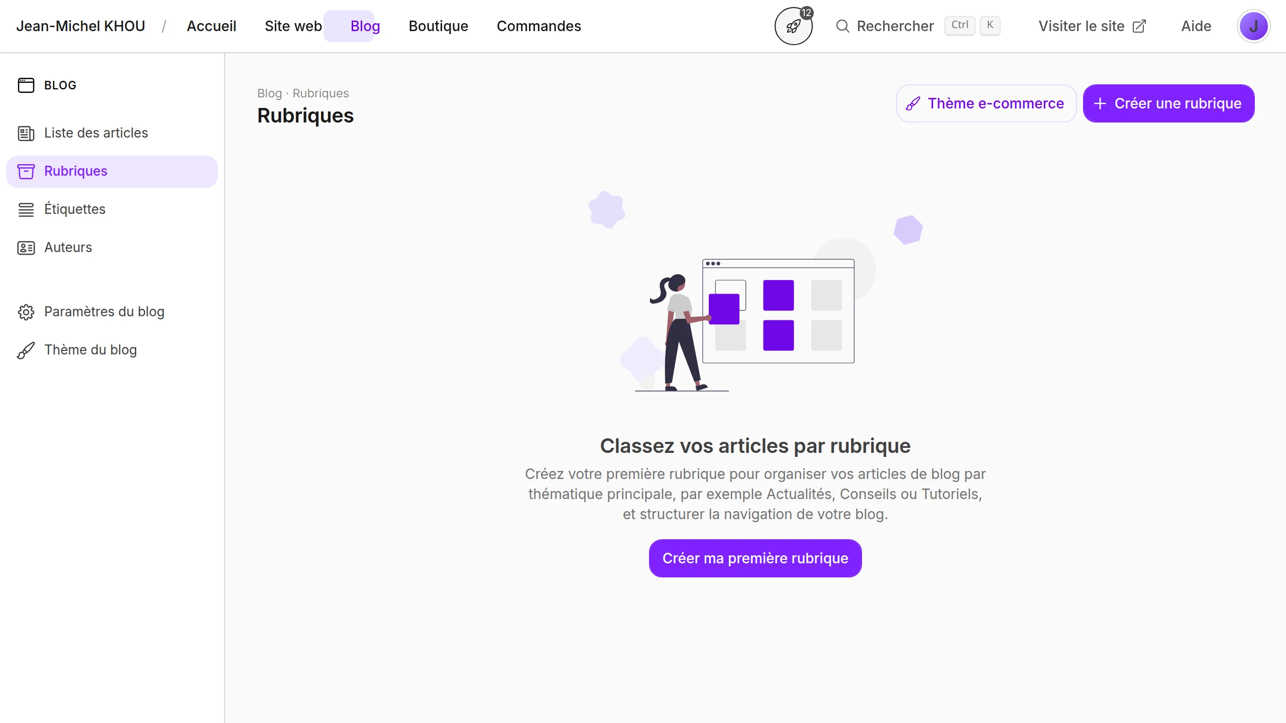 La page Rubriques organise vos articles de blog par grandes thématiques (par exemple Actualités, Conseils, Tutoriels). Venez ici dès que vous voulez créer une nouvelle rubrique, regrouper plusieurs articles sous un même thème, modifier le titre ou la description d'un blog, ou réordonner les rubriques telles qu'elles apparaissent sur le site.