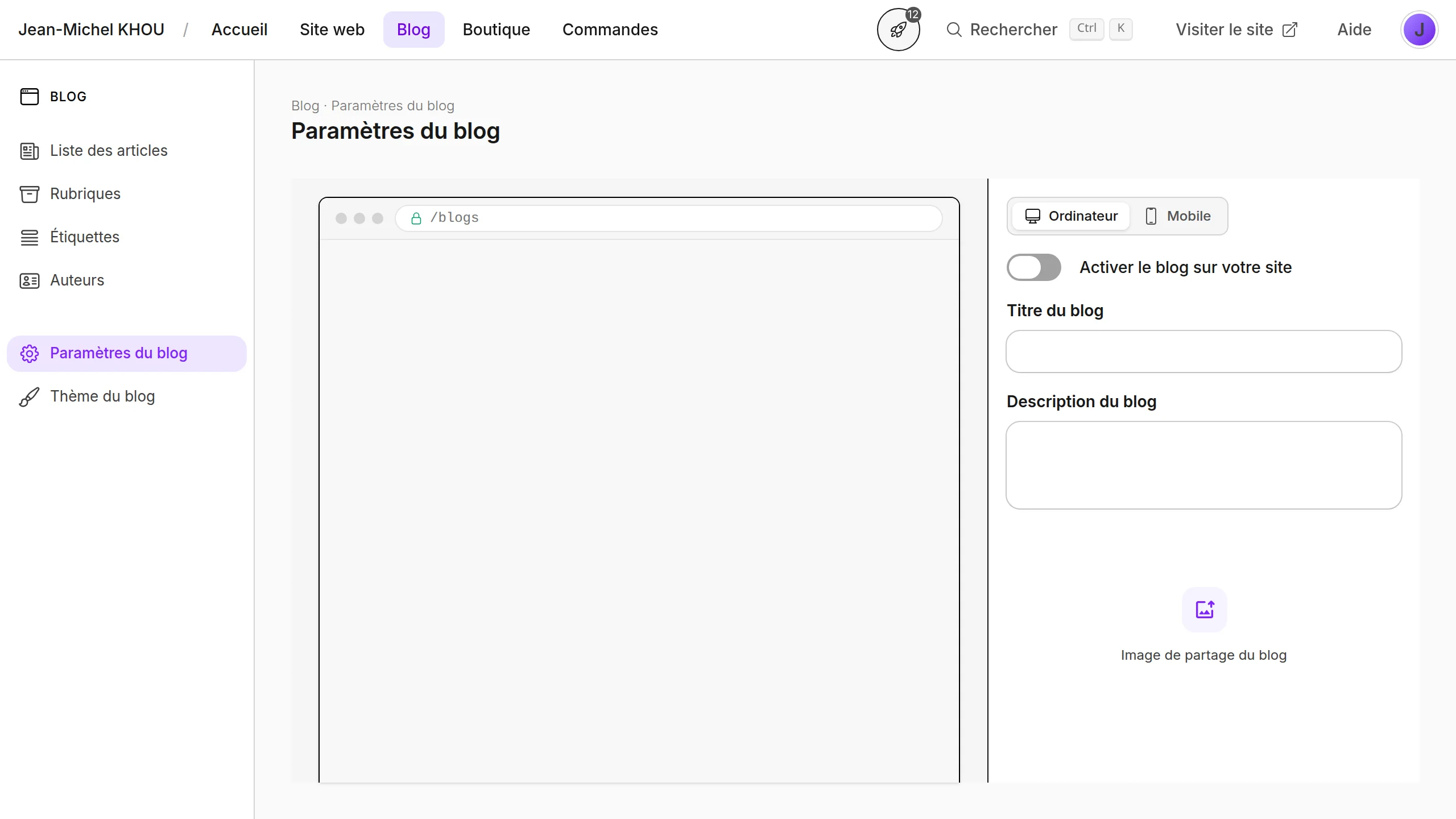 - Image de partage du blog — image utilisée lorsqu'un lien vers le blog est partagé sur les réseaux sociaux ; choisissez une image représentative au format paysage pour un rendu propre sur tous les supports.