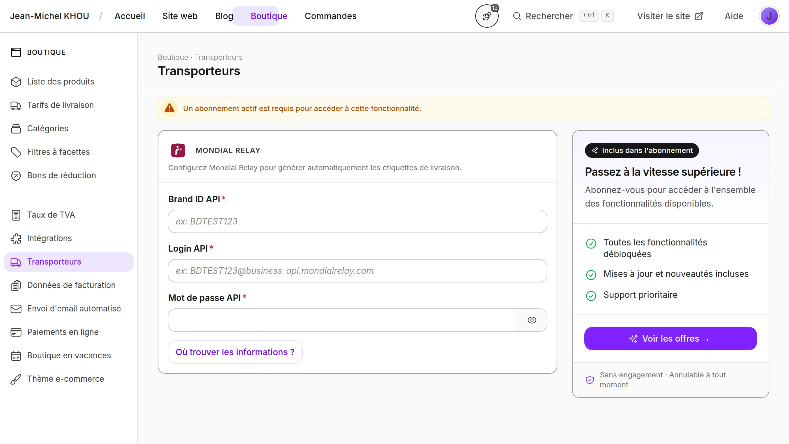 Cette page centralise la configuration des transporteurs partenaires utilisés pour expédier vos commandes. Vous y venez dès que vous ouvrez un compte chez un transporteur, que vos identifiants API changent ou que vous souhaitez commencer à générer automatiquement vos étiquettes d'expédition. Une fois le transporteur connecté, créez le mode de livraison correspondant depuis Tarifs de livraison.