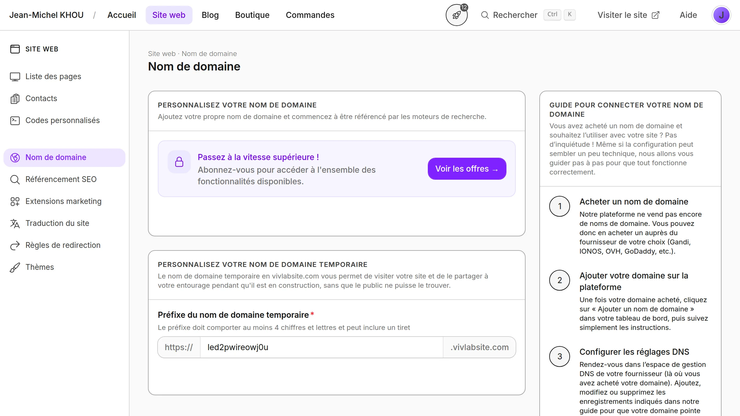 La section Nom de domaine permet de connecter votre propre nom de domaine à votre site Vivlab, et de personnaliser le sous-domaine temporaire en vivlabsite.com utilisé pendant la phase de construction. Un domaine personnalisé est indispensable pour être référencé par Google et renforcer la crédibilité de votre boutique.