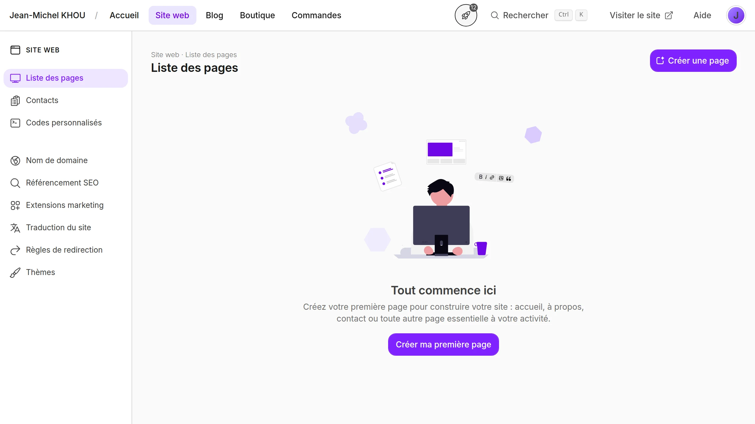 Venez ici lorsque vous souhaitez ajouter une nouvelle page à votre site, que vous voulez modifier le contenu d'une page existante, que vous devez changer l'ordre d'affichage des pages dans la barre de navigation ou le pied de page, ou simplement pour prévisualiser le rendu d'une page sur desktop et sur mobile avant de la modifier.