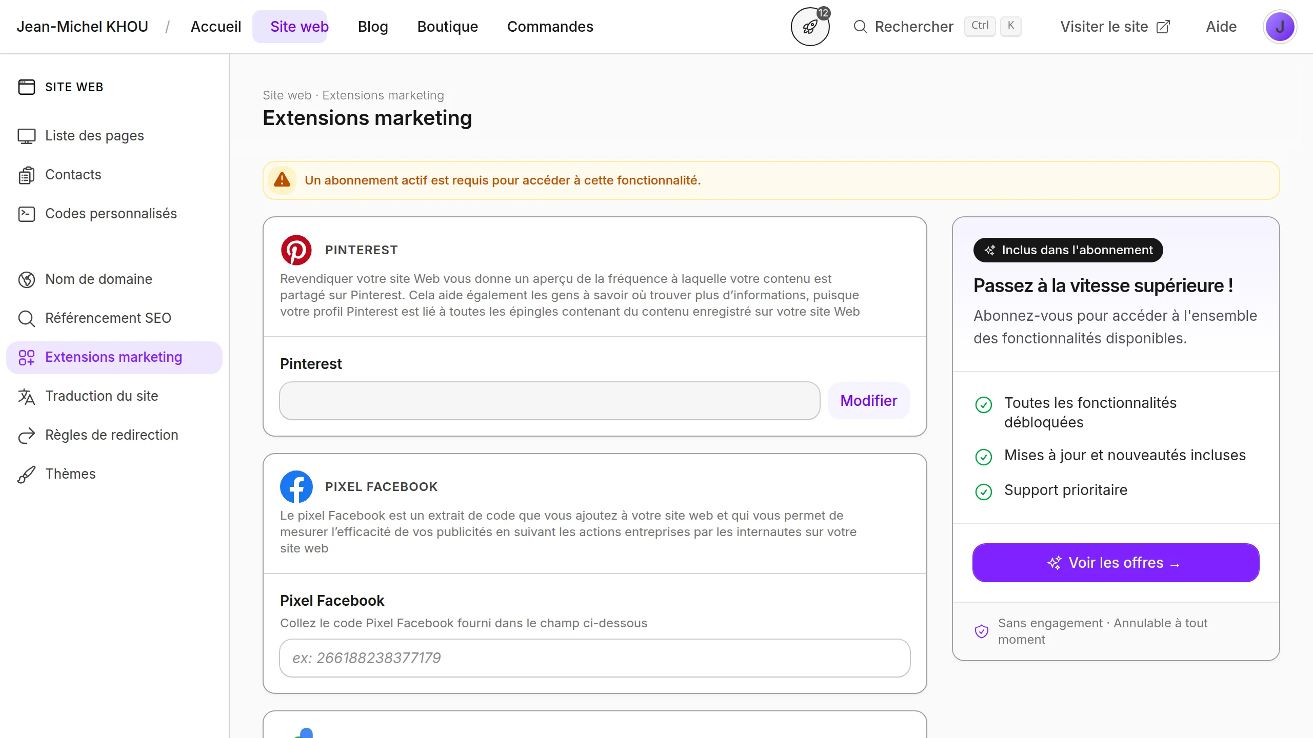 La section Extensions marketing permet de connecter votre site aux principales plateformes d'analyse d'audience et de publicité — Google, Facebook, Pinterest — en collant simplement l'identifiant ou la balise fournie par chaque service. Ces connexions activent le suivi de vos visiteurs, alimentent vos campagnes publicitaires et vérifient la propriété de votre site auprès de chaque plateforme.