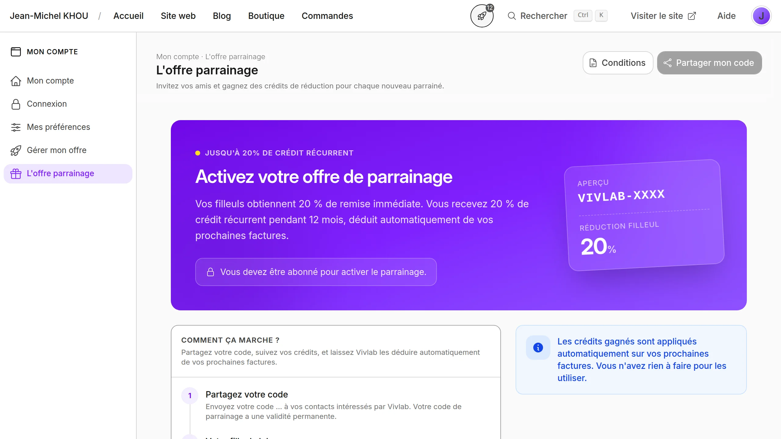 Affiche le code unique à partager avec vos filleuls. Tant qu'il n'est pas généré, cliquez sur Activer le parrainage : cette action n'est disponible que si vous avez un abonnement actif.