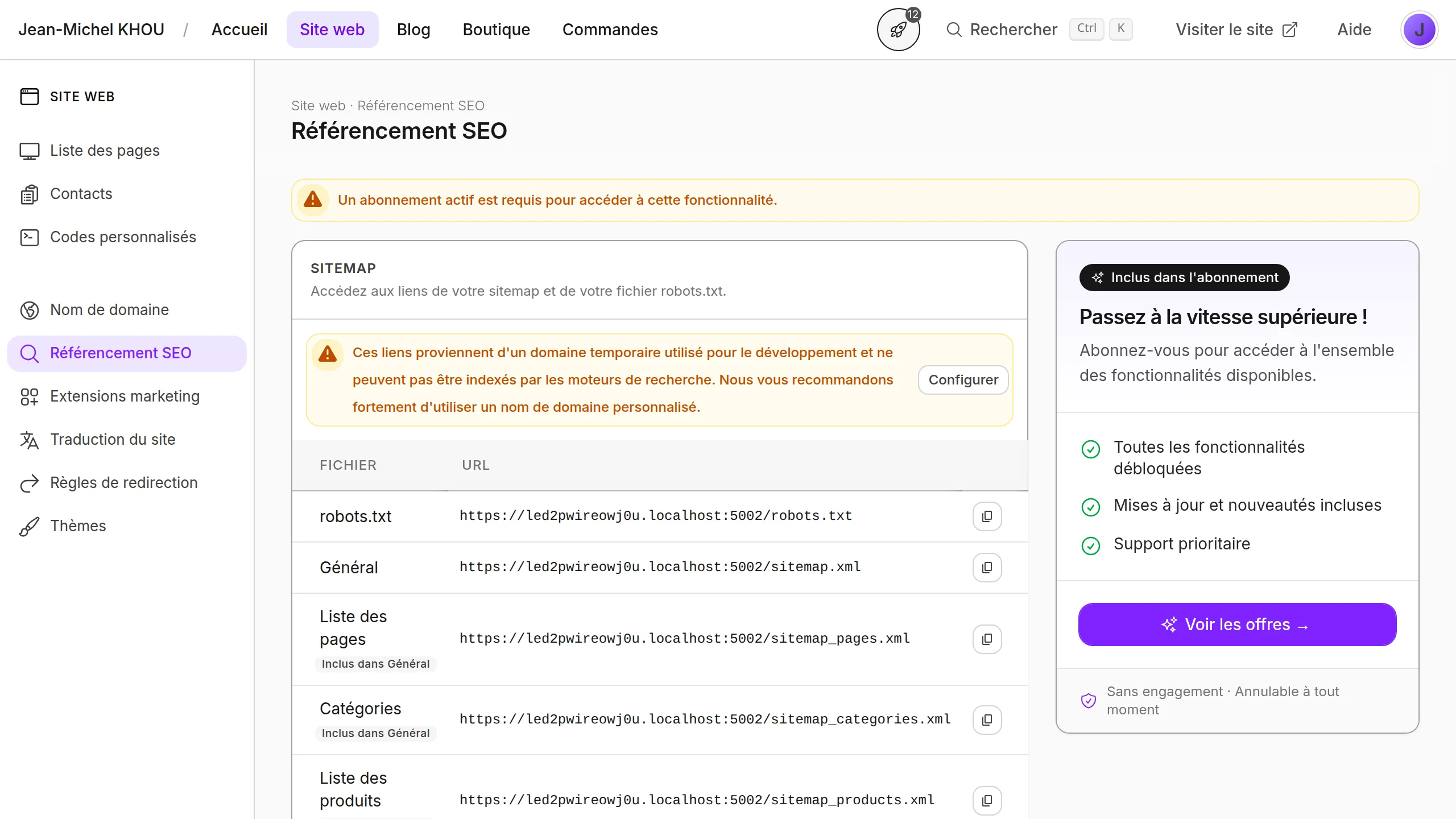 Si un avertissement indique que vos liens proviennent d'un domaine temporaire, c'est que votre boutique utilise encore l'adresse de développement fournie par Vivlab. Les moteurs de recherche ne peuvent pas indexer ces liens : cliquez sur Configurer pour définir un nom de domaine personnalisé avant de soumettre votre sitemap.