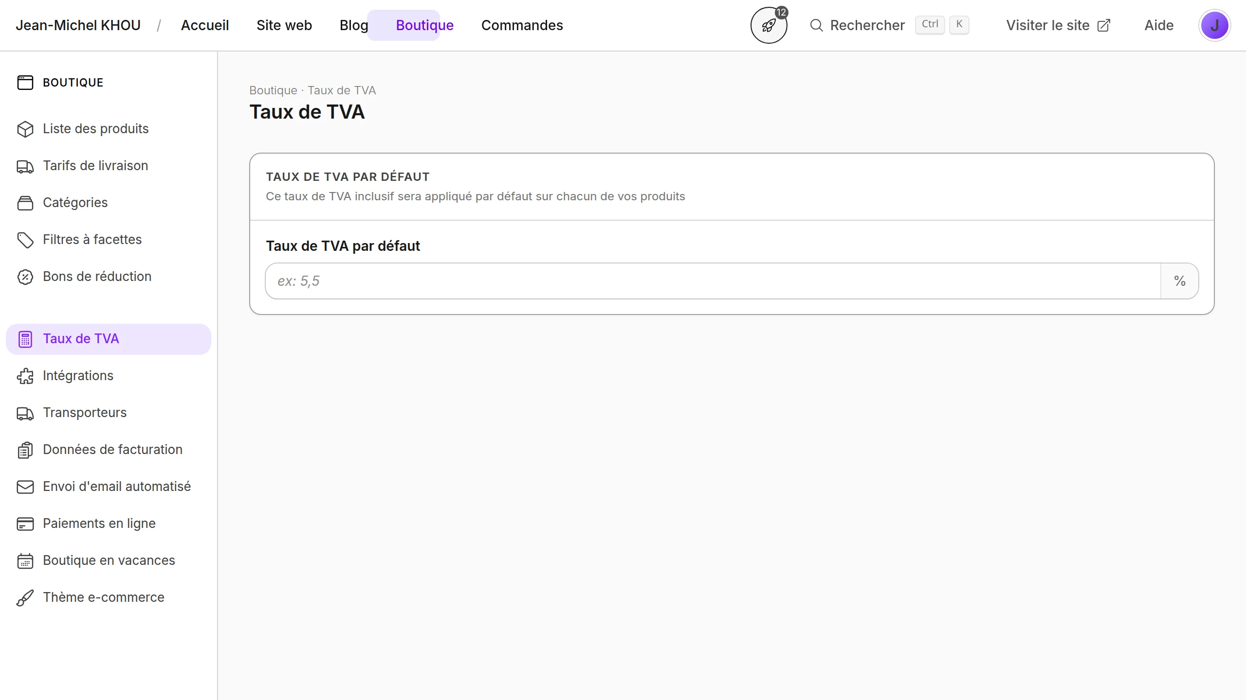 La section Taux de TVA permet de paramétrer la TVA appliquée par défaut à vos produits. Vous y venez dès que votre statut fiscal évolue (passage à l'assujettissement, changement de régime), que le taux en vigueur change, ou lorsque votre comptable vous demande d'ajuster la TVA affichée sur les factures et dans le tunnel de commande.