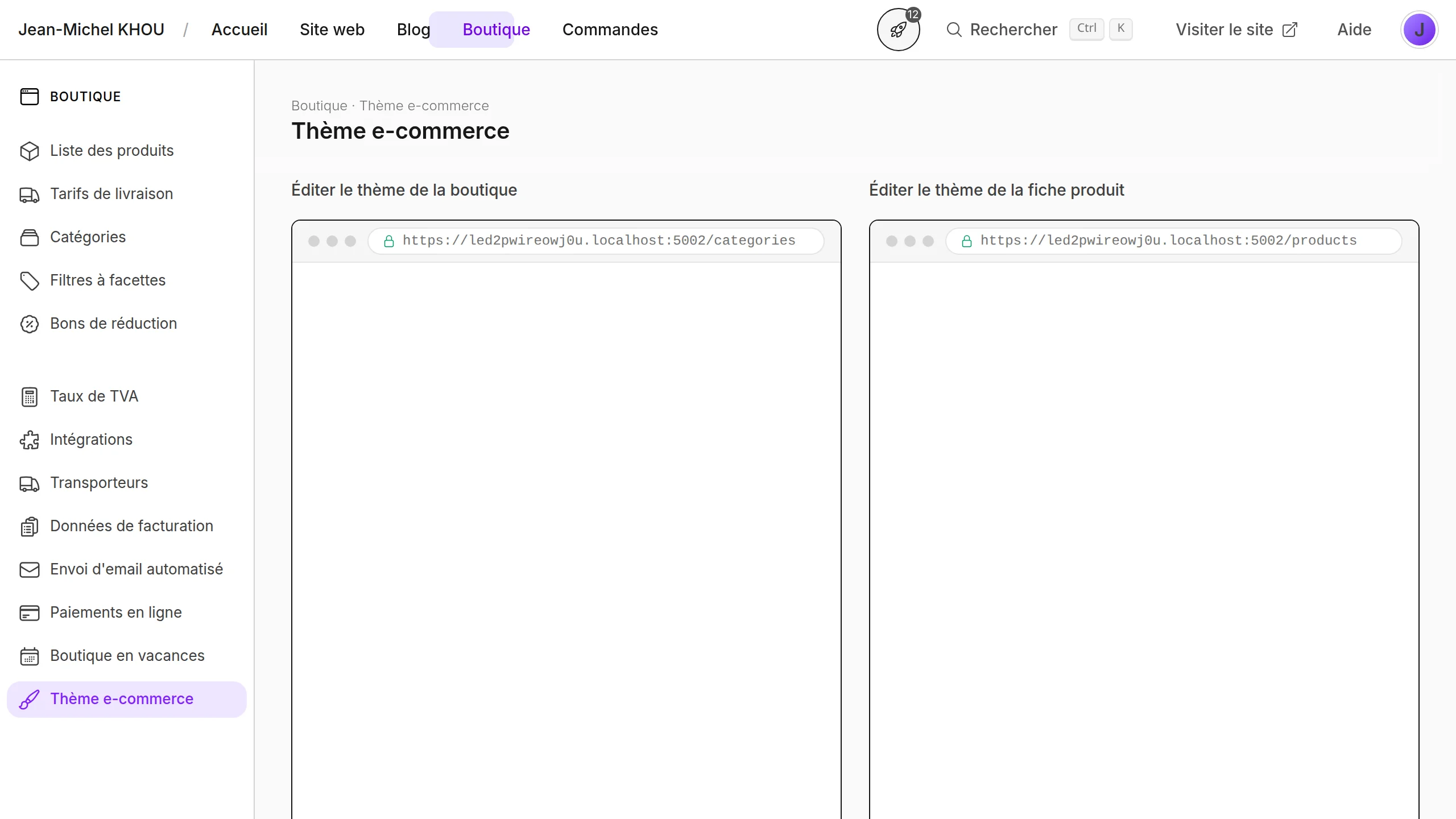 Cette page centralise la personnalisation graphique des pages e-commerce de votre site : la liste des produits (boutique) et la fiche produit. Vous y venez lorsque vous démarrez votre site, que vous souhaitez aligner l'apparence de la boutique sur votre identité visuelle, ou que vous voulez ajuster la présentation d'une fiche produit.